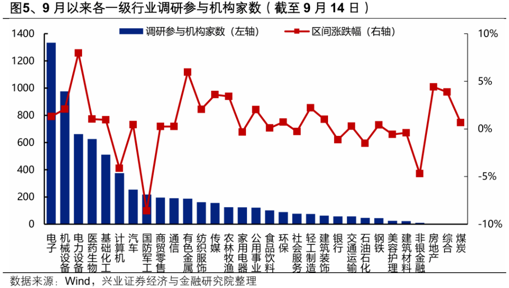 统计9月以来各行业及公司的机构调研数据:行业层面,9月以来电子、机械、电力设备、医药、化工、计算机、汽车等一级行业调研参与机构家数居前,具体到二级行业主要包括电子(半导体、消费电子、元件等)、机械(自动化设备等)、电力设备(光伏设备、电网设备、电池)、医药(化学制品、医疗器械等)、化工(化学制品)、计算机(软件开发、IT服务)、汽车(汽车零部件),还包括通信设备、游戏、军工(军工电子、航空装备)等其他细分行业。